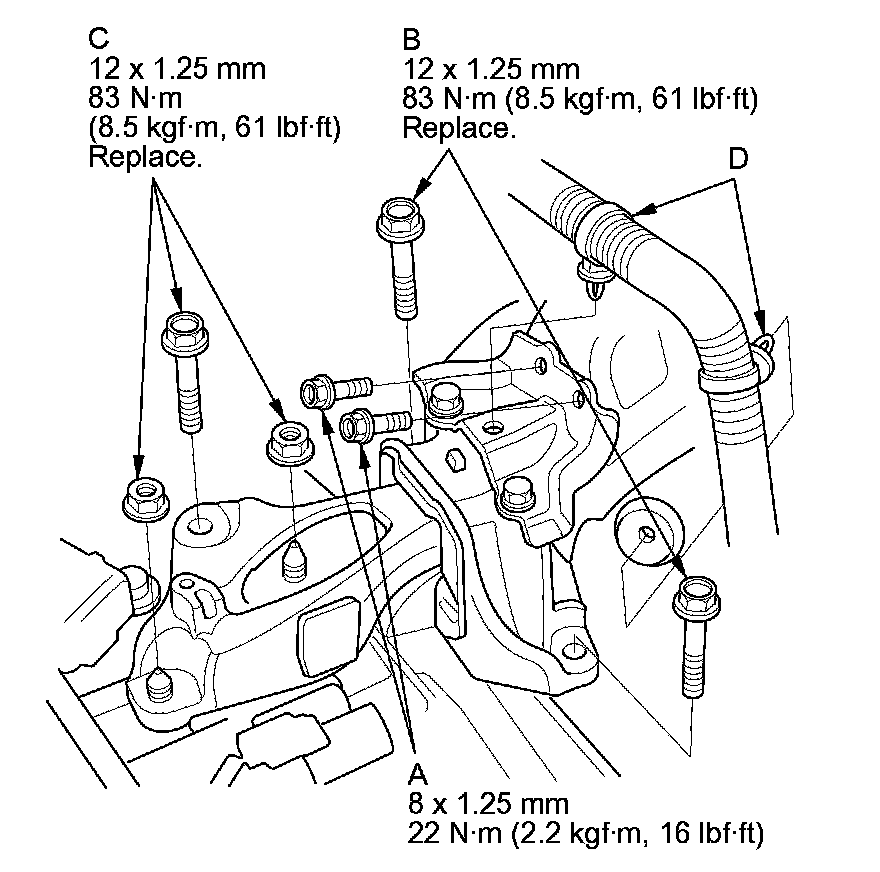 11. Loosely install the new transmission mount mounting bolt and nuts (C), then tighten to the specified torque.