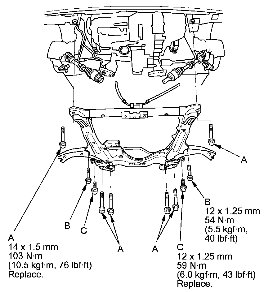 15. Loosely install the new front subframe mounting 14 x 1.5 mm bolts (A), the lower arm bracket mounting 12 x 1.25 mm bolts (B), and the new front subframe mounting 12 x 1.25 mm bolts (C).