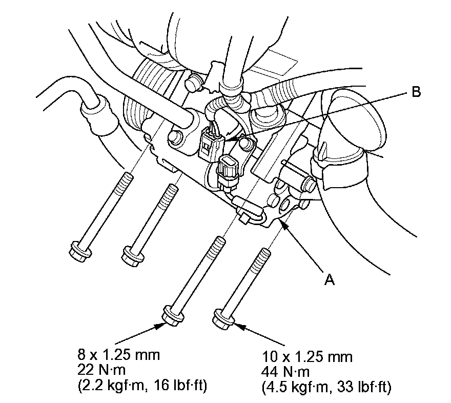 10. Install the transmission mount, then tighten the transmission mount stiffener mounting bolts (A) and the new transmission mount mounting bolts (B).