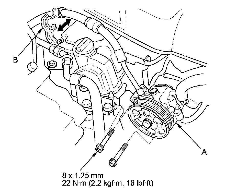 39. Install the power steering pump (A), then install the power steering hose to the clamp (B).