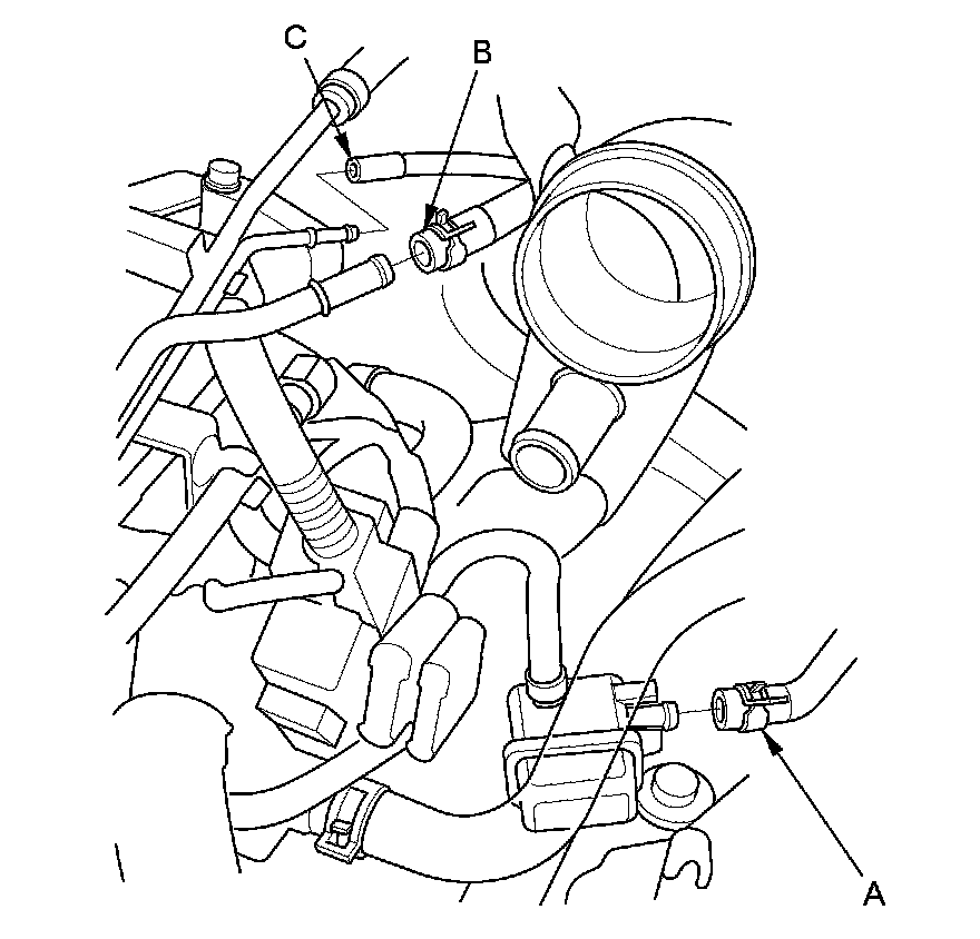 42. Connect the EVAP canister hose (A), the brake booster vacuum hose (B), and the vacuum hose (C).