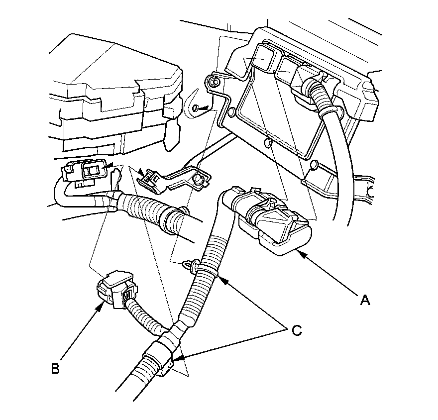 52. Install the battery base (A), then install the harness clamps (B) and auxiliary under-hood fuse/relay box (C).