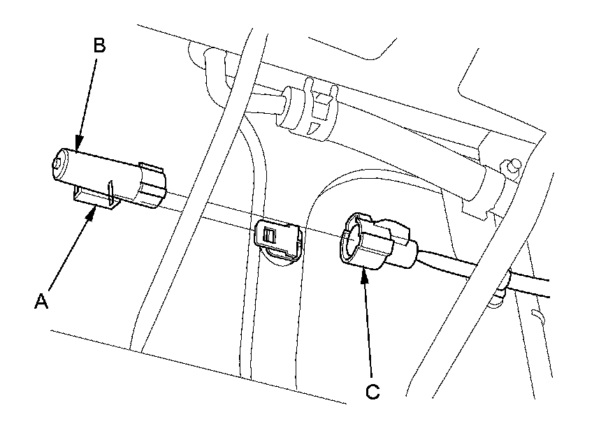 1. Lift the tab (A) to release the lock, then remove the outside air temperature sensor (B) from the front bumper beam. Disconnect the 2P connector (C) from the outside air temperature sensor.