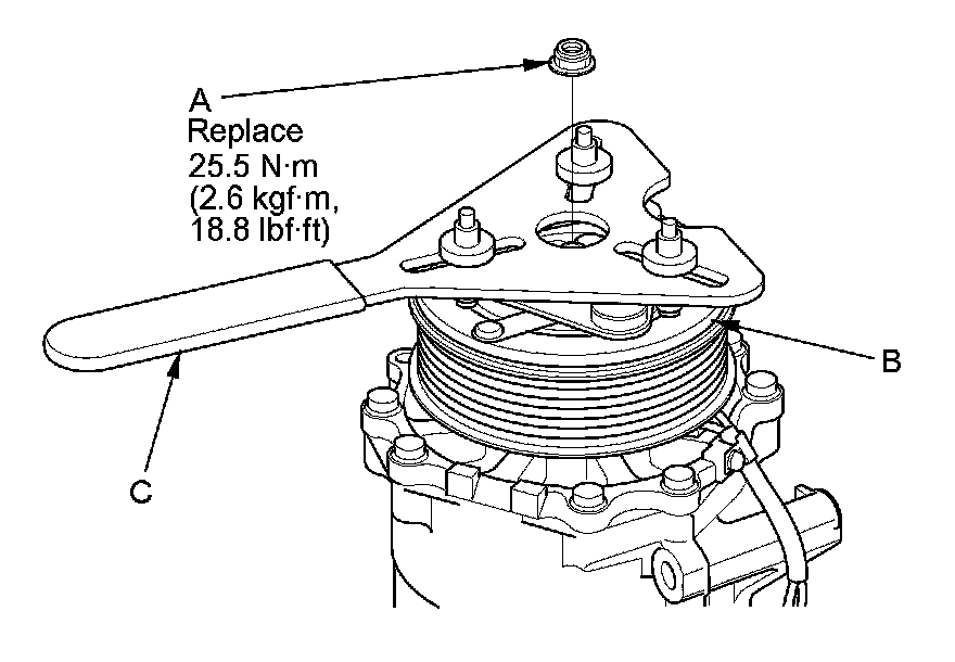 1. Remove the center nut (A) while holding the armature plate (B) with a commercially available A/C clutch holder (C).