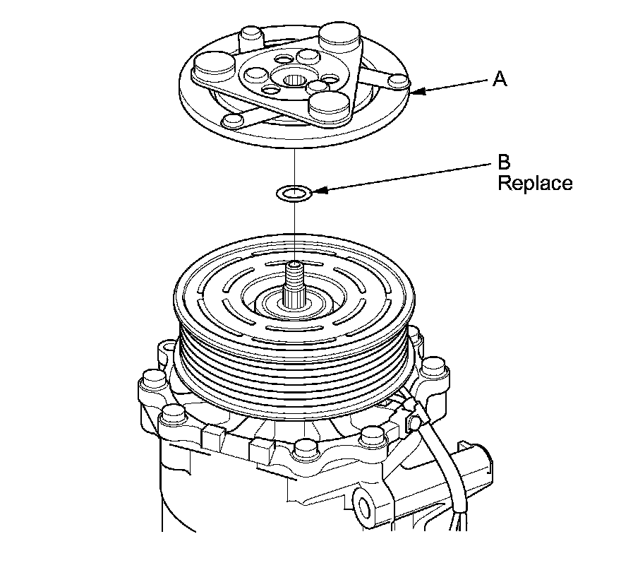 - When replacing the clutch set, place a trial stack of shims, 1 mm total thickness, on the A/C compressor shaft. Install the armature plate, and check its clearance Testing and Inspection. If the clearance is not with specification, add or subtract shims as needed