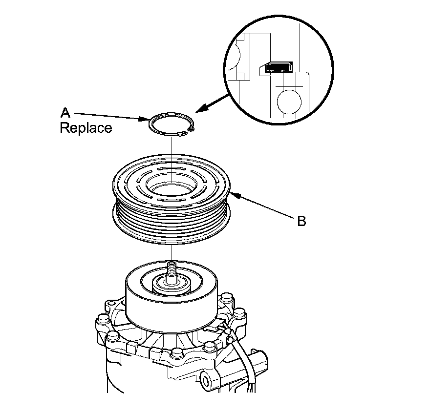 3. If you are replacing the field coil, remove the snap ring (A) with snap ring pliers, then remove the rotor pulley (B). Be careful not to damage the rotor pulley and A/C compressor.