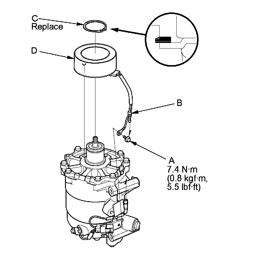 4. Remove the bolt (A), then disconnect the field coil connector (B). Remove the snap ring (C) with snap ring pliers, then remove the field coil (D). Be careful not to damage the field coil and A/C compressor.