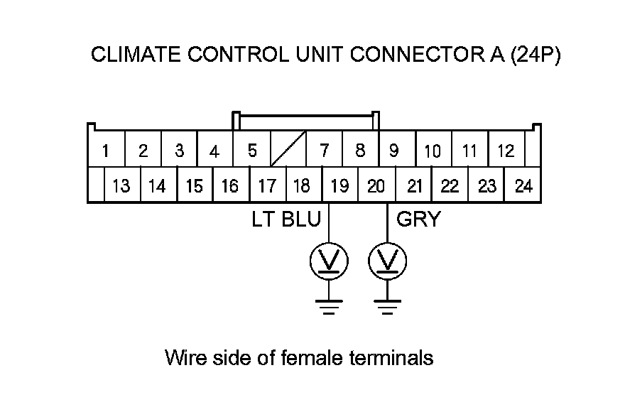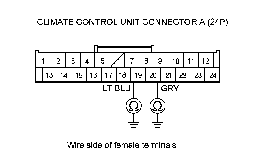 8. Check for continuity between body ground and climate control unit connector A (24P) terminals No. 19 and No. 20 individually.