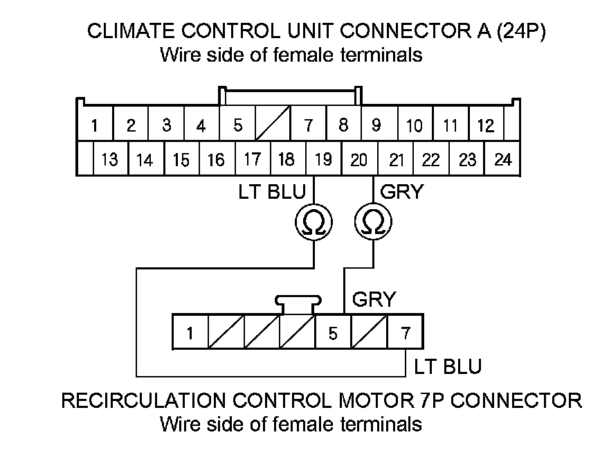 11. Check for continuity between the following terminals of climate control unit connector A (24P) and the recirculation control motor 7P connector.
