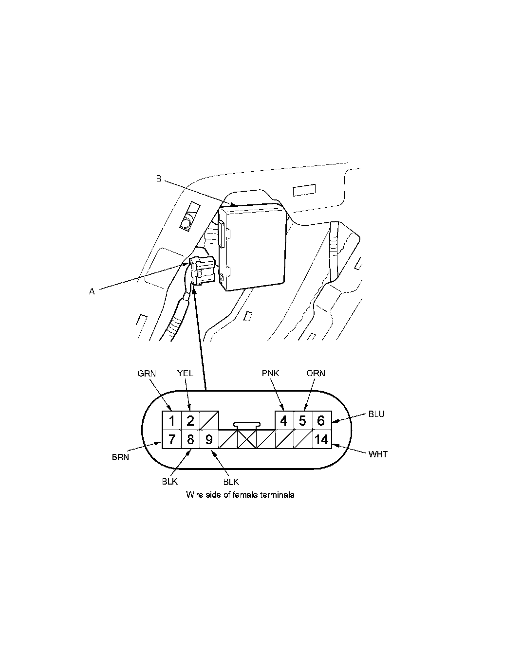 3. Disconnect the 14P connector (A) from the automatic lighting control unit (B).