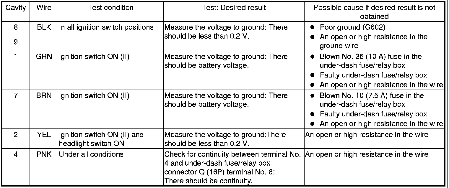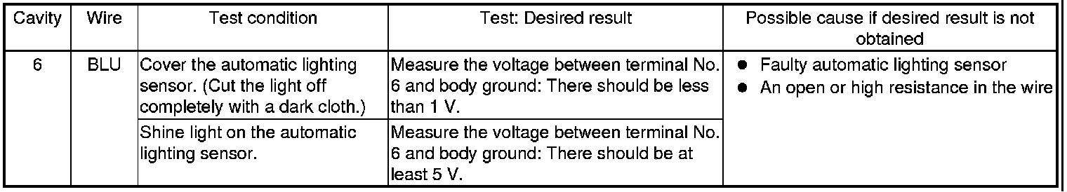 5. Reconnect the automatic lighting control unit connector, and do the following input tests:
