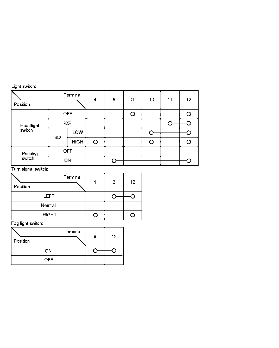 - If the terminals look OK, check for continuity between the terminals in each switch position according to the tables.
