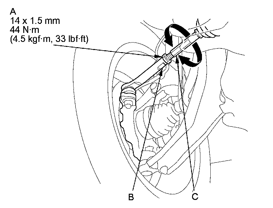 3. Loosen the tie-rod locknuts (A) while holding the flat surface sections (B) of the tie-rod end with a wrench, and turn both tie-rods (C) until the front toe is within specifications.