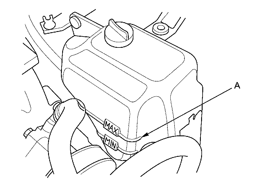 6. Fill the coolant reservoir to the MAX mark (A) with Acura Long Life Antifreeze/Coolant Type 2 (P/N OL999-9011A).