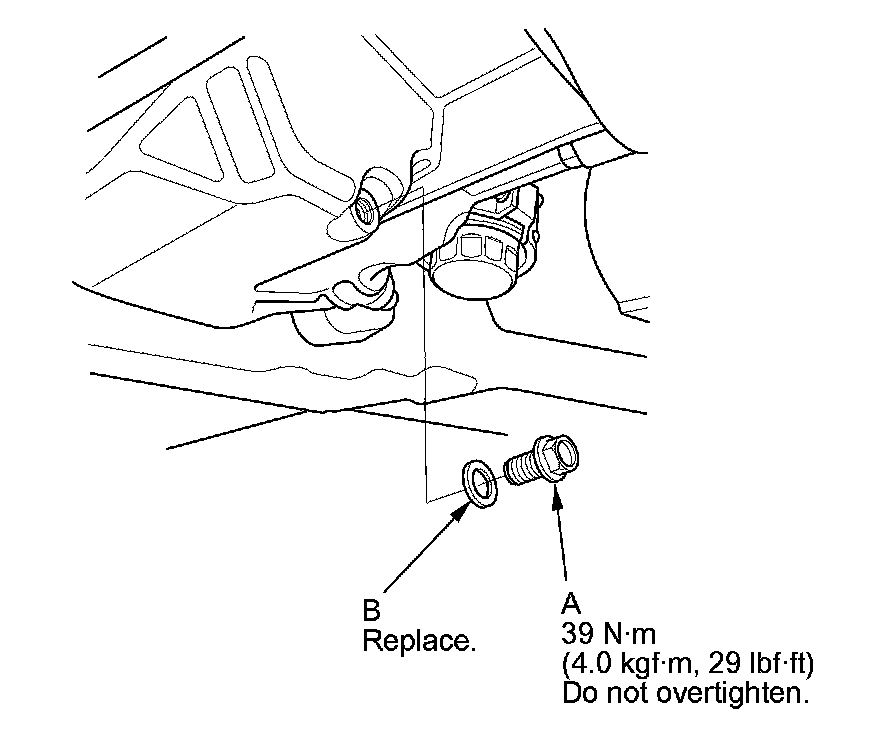 3. Reinstall the drain bolt with a new washer (B).