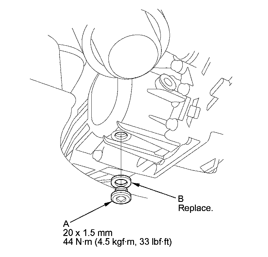 4. Reinstall the drain plug with a new sealing washer (B).