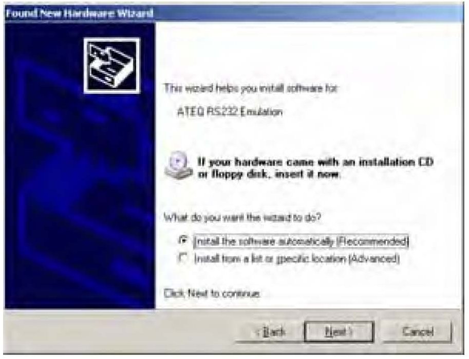 4. The Found New Hardware Wizard prompts you to install the ATEQ RS232 Emulation software. Select Install the software automatically (Recommended), then select Next.
