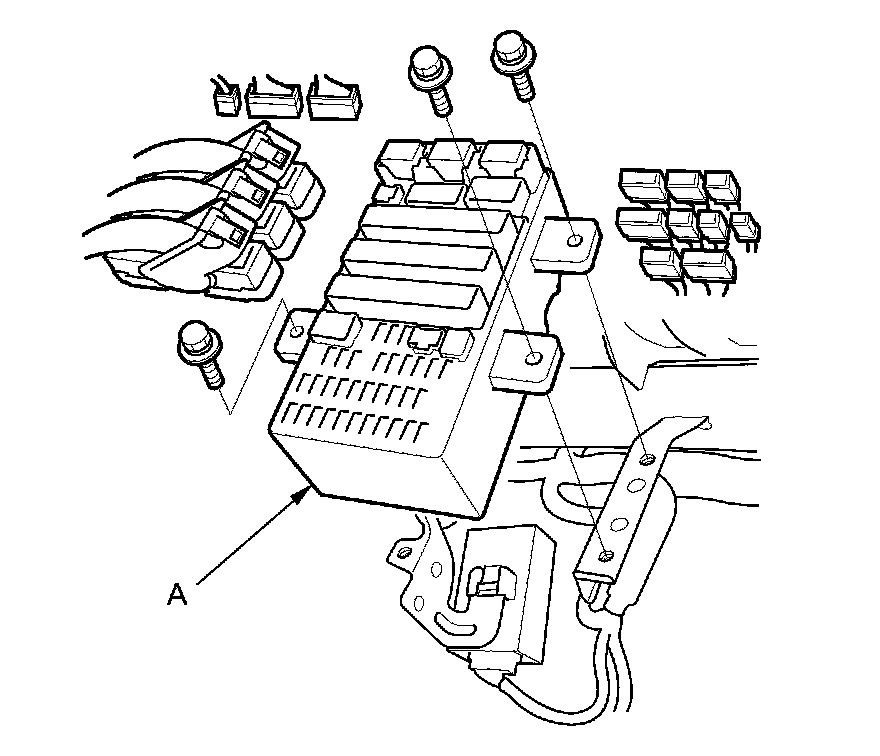 3. Disconnect the connectors from the fuse side of the under-dash fuse/relay box (A).