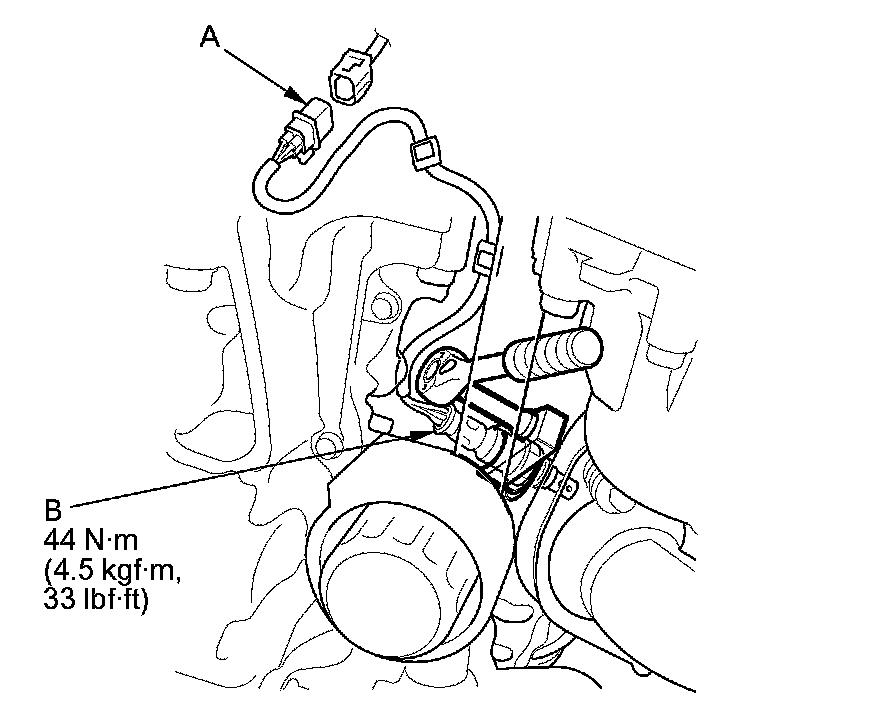 3. Disconnect the secondary HO2S 4P connector (A), then remove the secondary HO2S (B).