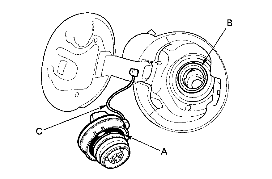 2. Check the fuel fill cap seal (A) and the fuel fill pipe mating surface (B). Verify that the fuel fill cap tether cord (C) is not caught under the cap.
