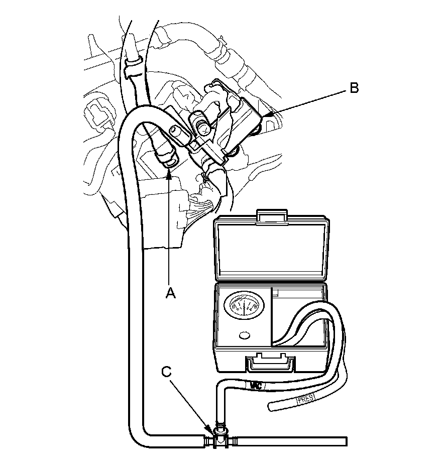 9. Disconnect the vacuum hose (A) from the EVAP canister purge valve (B) in the engine compartment, and connect a T-fitting (C) from the vacuum gauge and the vacuum pump/gauge 0-30 inHg, to the EVAP canister purge valve as shown.