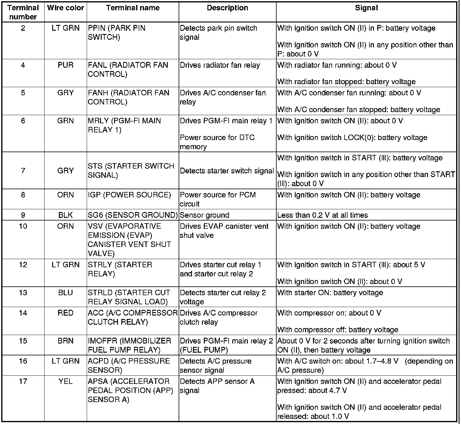 PCM Inputs and Outputs at PCM Connector A (Square) (44P)
