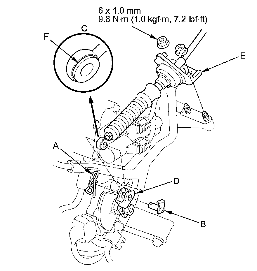 6. Check the bushing (F) in the shift cable end for proper fit and wear. If the bushing is loose or worn, replace the shift cable Service and Repair.