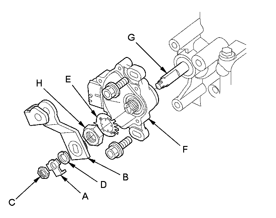 9. Pry the lock tabs of the lock washer (E) on the transmission range switch (F), hold the selector control shaft (G) with a 6.0 mm wrench, and loosen the locknut (H).