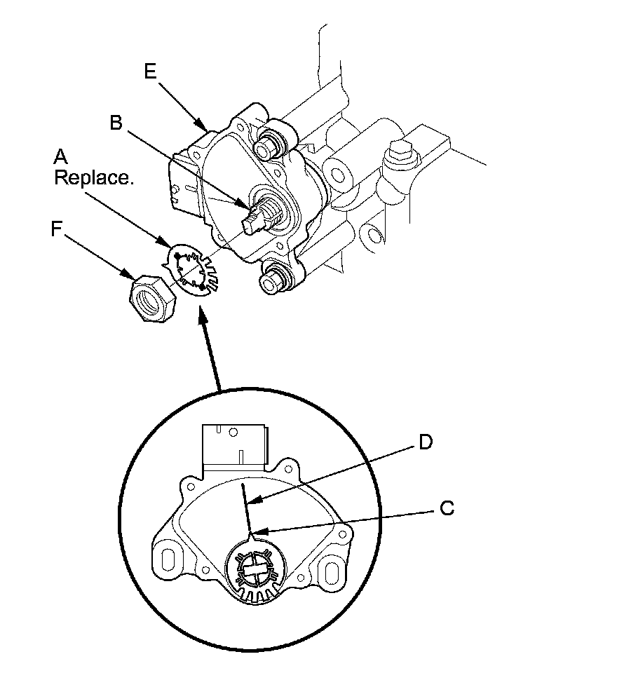 14. Install a new lock washer (A) over the selector control shaft (B) by aligning the projection (C) of the lock washer with the N positioning line (D) on the transmission range switch (E), and install the locknut (F).