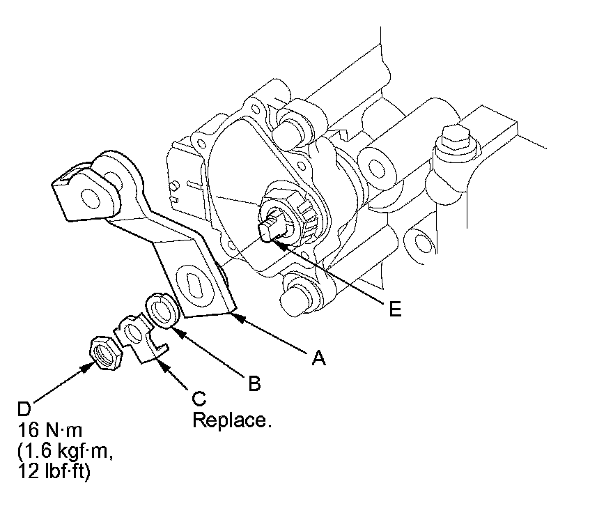 17. Install the selector control lever (A), spring washer (B), a new lock washer (C), and locknut (D) on the selector control shaft (E). Bend the lock tab of the lock washer against the locknut.