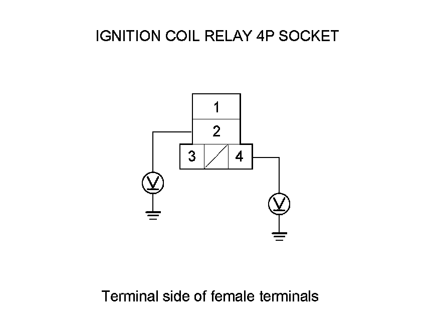 3. Measure the voltage between ignition coil relay 4P socket terminal No. 2 and body ground, then terminal No. 4 and body ground.