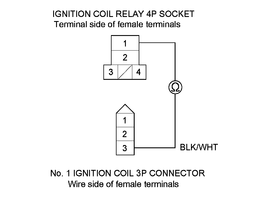 4. Check for continuity between ignition coil relay 4P socket terminal No. 1 and No. 1 ignition coil 3P connector terminal No. 3.