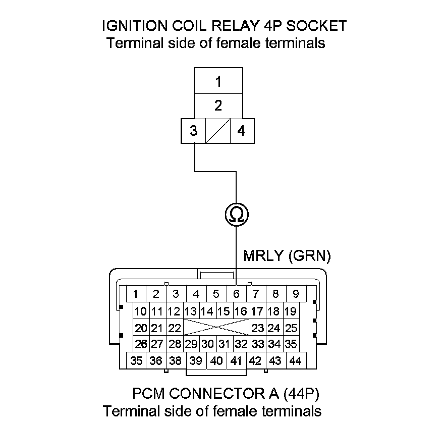11. Check for continuity between ignition coil relay 4P socket terminal No. 3 and PCM connector terminal A6.