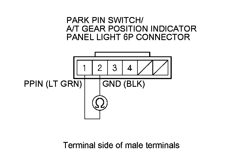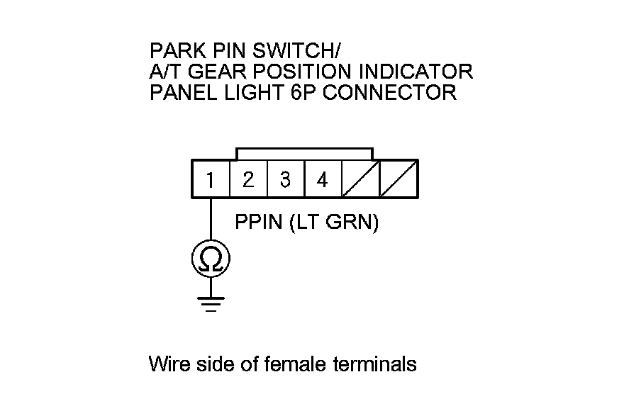 8. Check for continuity between the park pin switch/A/T gear position indicator panel light 6P connector terminal No. 1 and body ground.