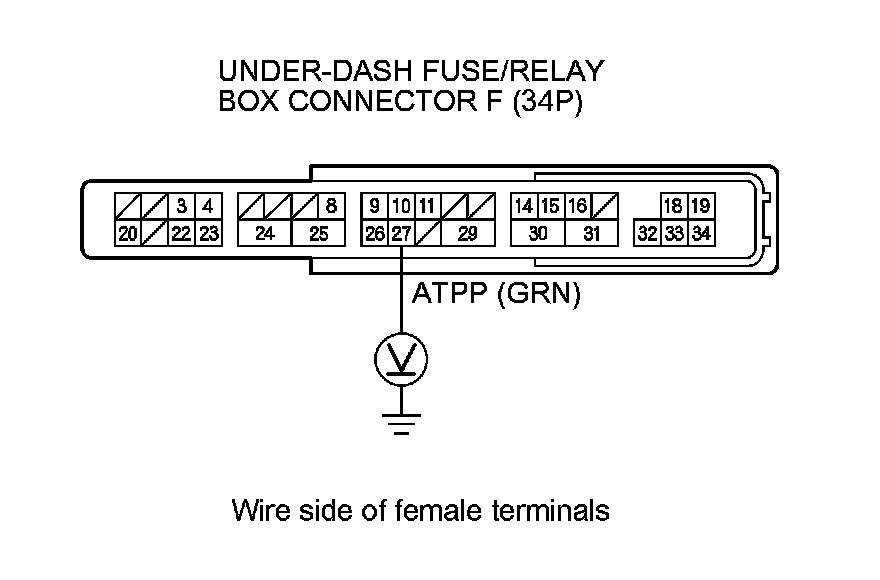 13. Measure voltage between the under-dash fuse/relay box connector F (34P) terminal No. 27 and body ground.