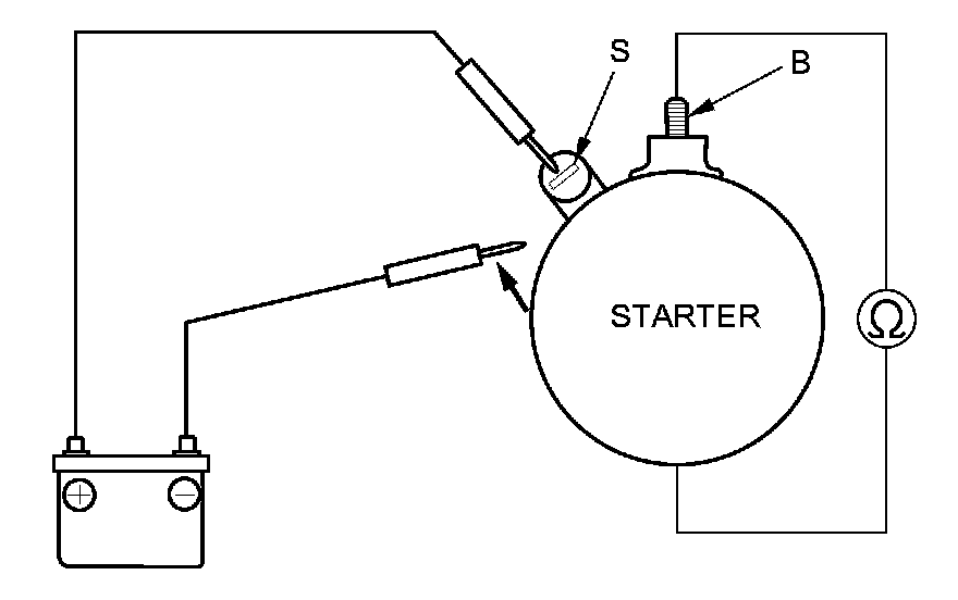 4. Connect the battery as shown, and check for continuity between the B terminal and the starter body. If there is continuity, it is working properly.