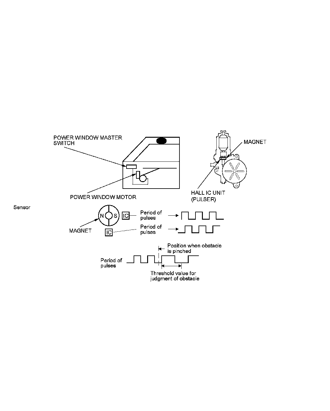 The power window motors incorporate a Hall IC unit (pulser), which generates pulses during the motor's operation and sends the pulses to the power window control units, As soon as the power window control units detect a change in pulse frequency from the Hall IC unit (pulser), the power window control units make the power window motor stop and reverse. If the window is more than halfway closed, it will reverse to the half open position. If the window is less than halfway closed, it will stop and reverse about 2 inches. This is to prevent pinching an obstacle during auto-up operation. The auto reverse operation is not active when the switch is held in the up position.