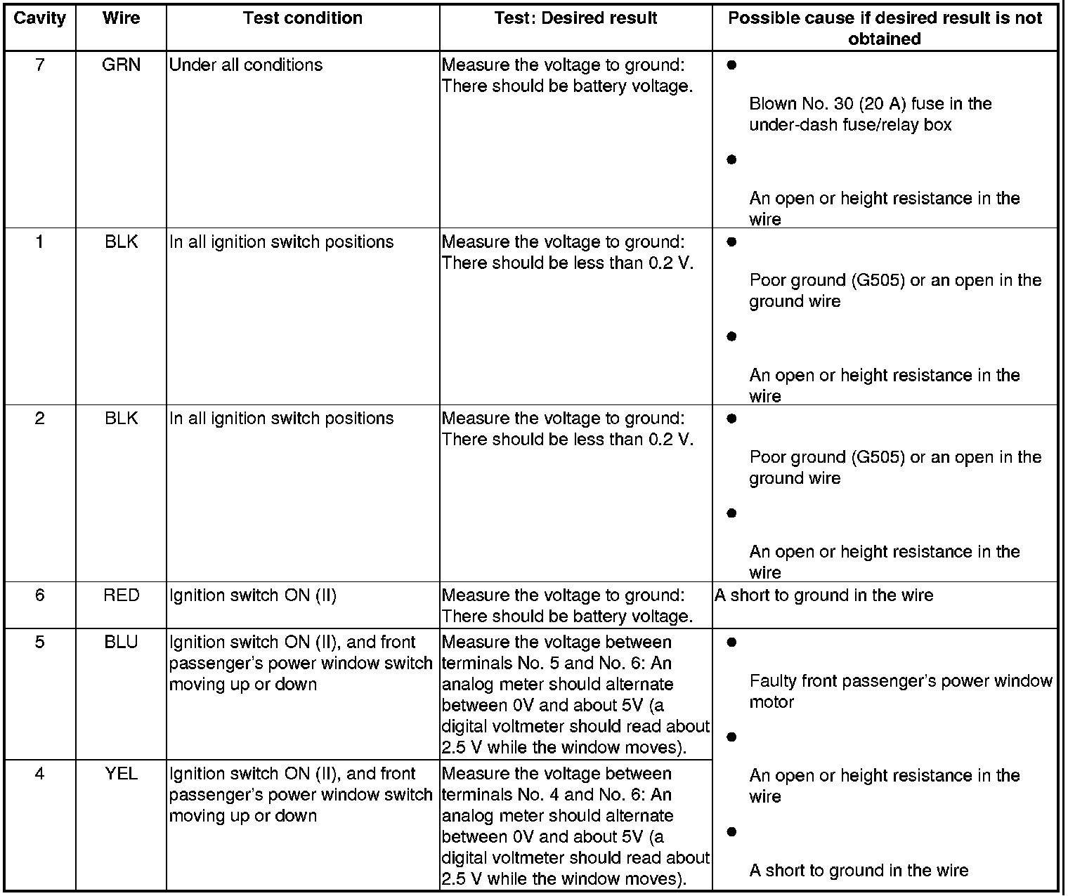 - If all the input tests prove OK, the front passenger's power window switch must be faulty; replace it Service and Repair.