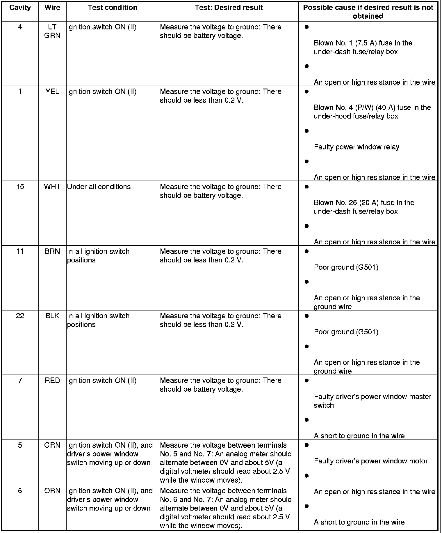 - If all the input tests prove OK, the power window master switch must be faulty; replace it Service and Repair.