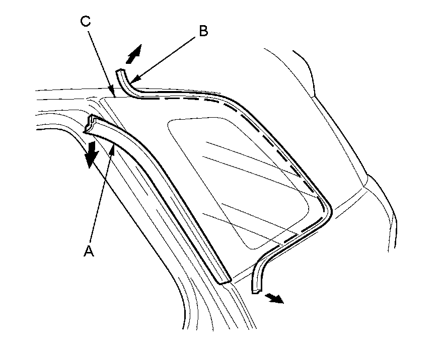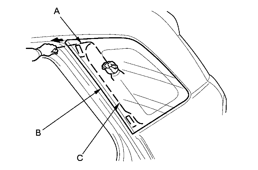 2. Remove the front seal (A) and the molding quarter seal (B) from the front edge of the quarter glass (C). If necessary, cut the seals with a utility knife.