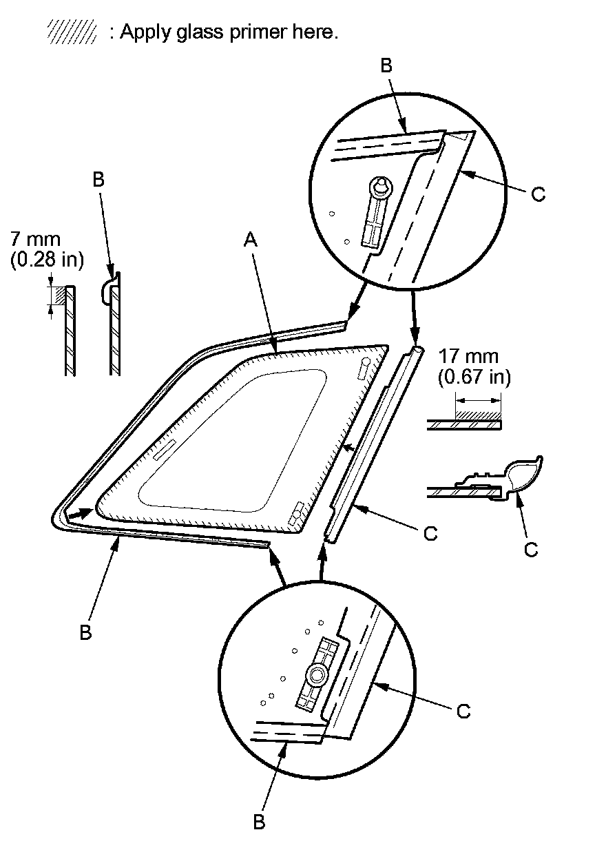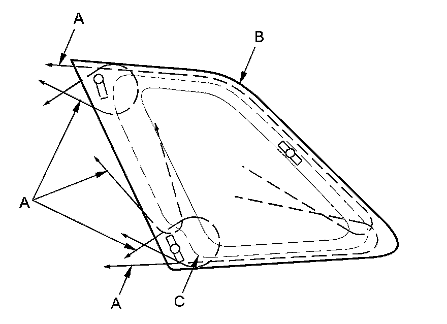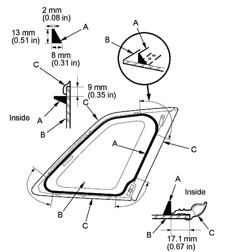15. Put the cartridge in a caulking gun, and run a continuous bead of the adhesive (A) to the quarter glass (B) along the seals (C) as shown. With the printed dots on the quarter glass as a guide, apply the adhesive to the upper and lower corner portions of the quarter glass. Apply the adhesive within 30 minutes after applying the glass primer. Make a slightly thicker bead at each corner.