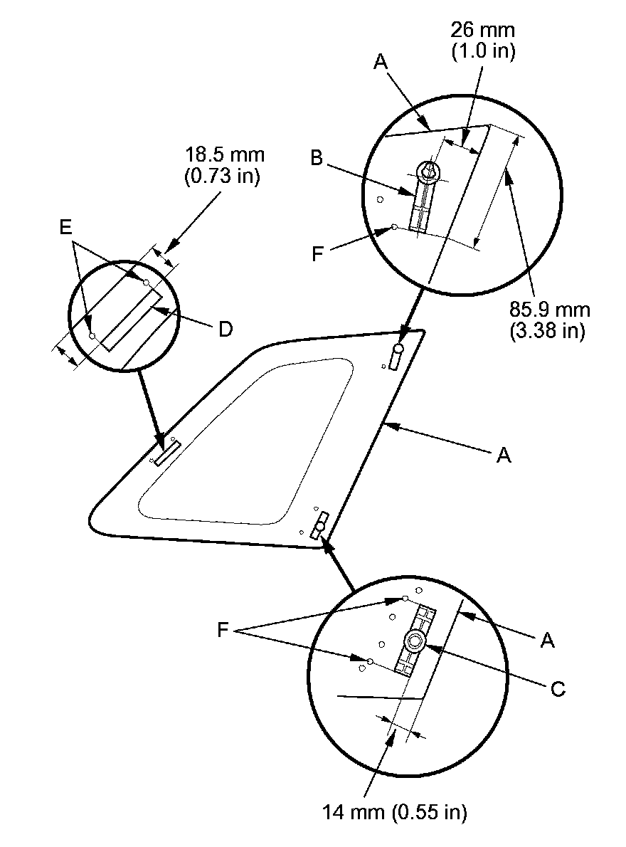 9. Apply glass primer to the clip mounting areas on the quarter glass (A), and let it dry. Remove the adhesive backing and attach the upper clip (B), the lower clip (C), and the rear clip (D) to the inside face of the quarter glass as shown.