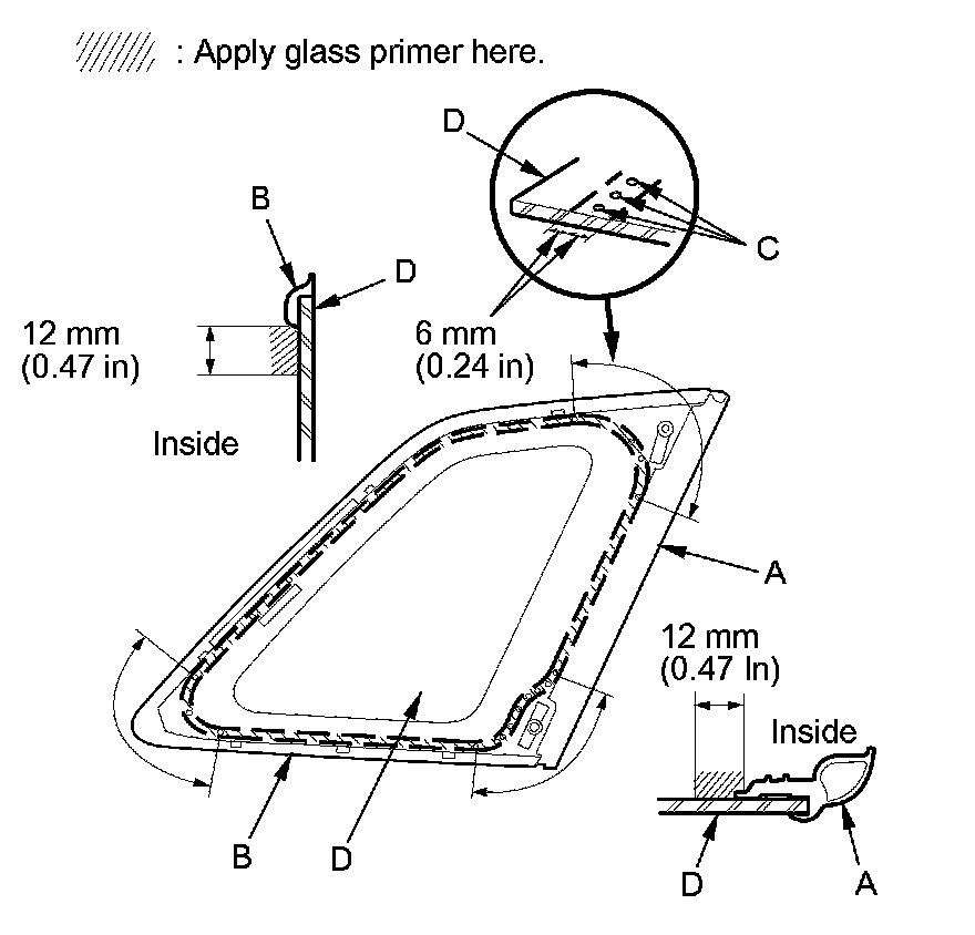 - With the printed dots (C) on the quarter glass (D) as a guide, apply the glass primer to the front portion of the quarter glass.