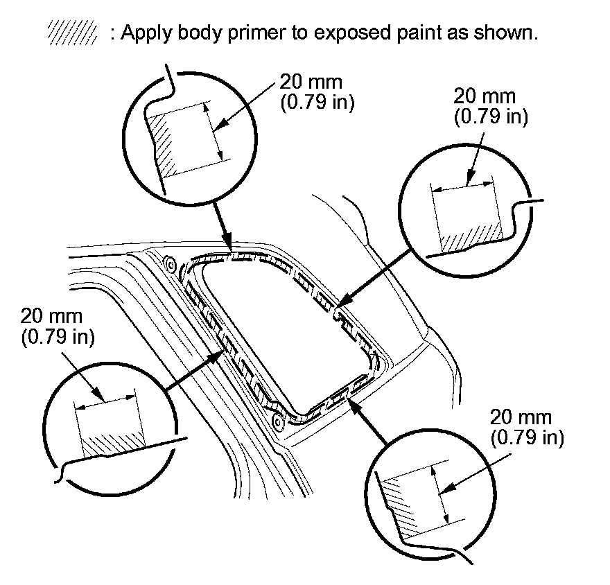 13. Carefully apply a light coat of body primer to any exposed paint or metal around the flange where the new adhesive will be applied. Let the body primer dry for at least 10 minutes:
