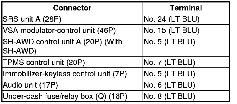 Repair a short in the wire between the DLC (K-line) and the VSA modulator-control unit, the SRS unit, the SH-AWD control unit (With SH-AWD), the TPMS control unit, the immobilizer-keyless control unit, the audio unit, or the under-dash fuse/relay box.�