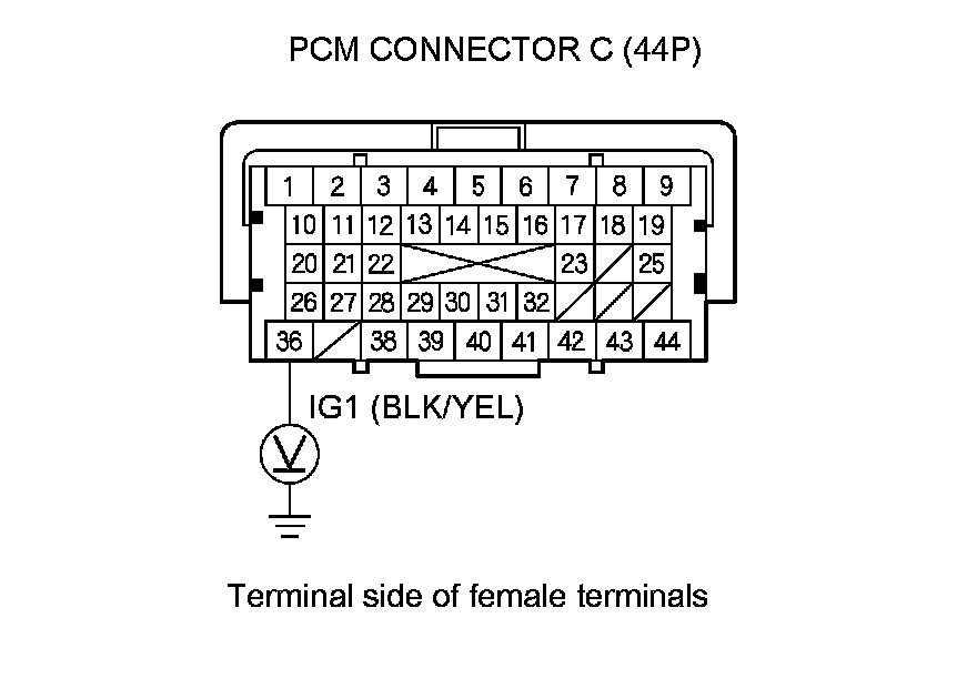 54. Measure the voltage between PCM connector terminal C36 and body ground.