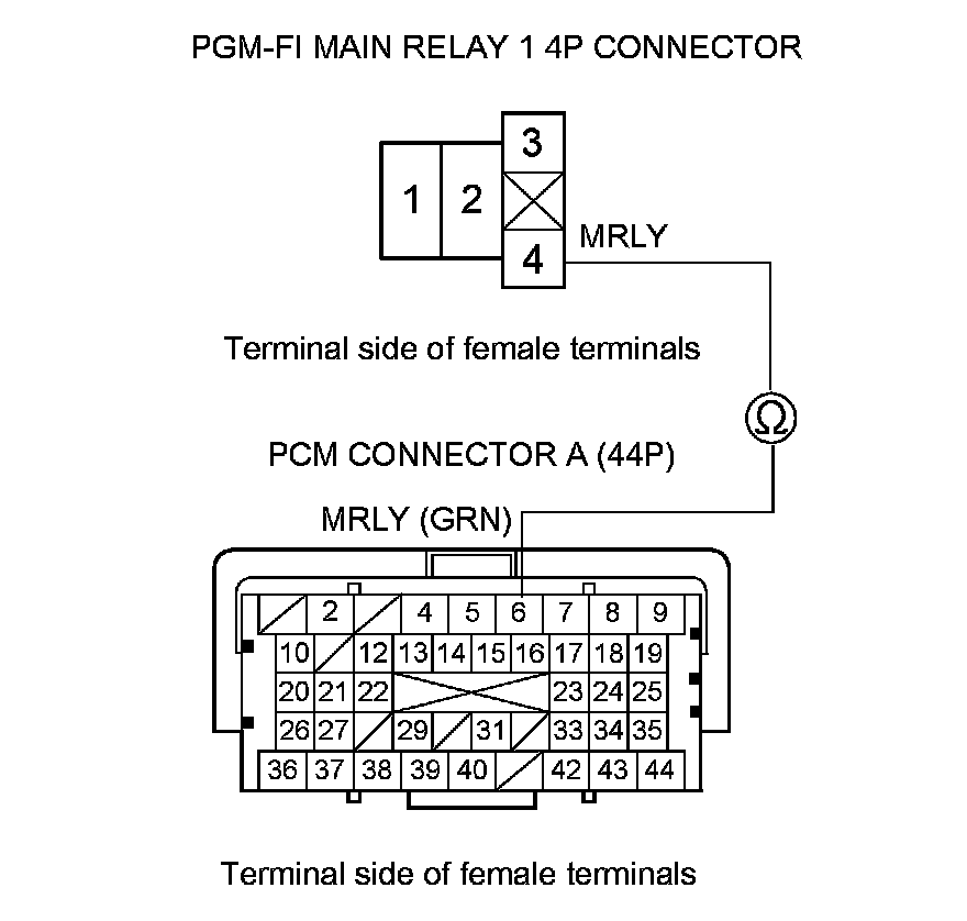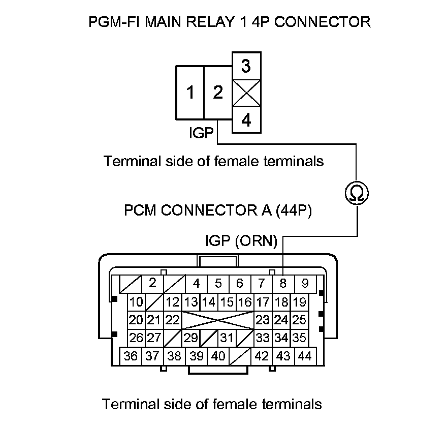 43. Check for continuity between PGM-FI main relay 1 4P connector terminal No. 2 and body ground.