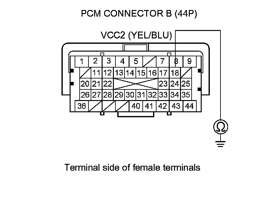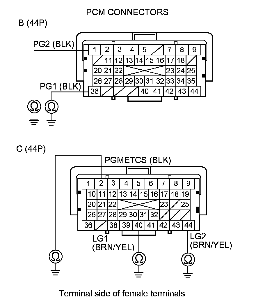 67. Check for continuity between body ground and PCM connector terminals B1, B36, C2, C40, and C44 individually.