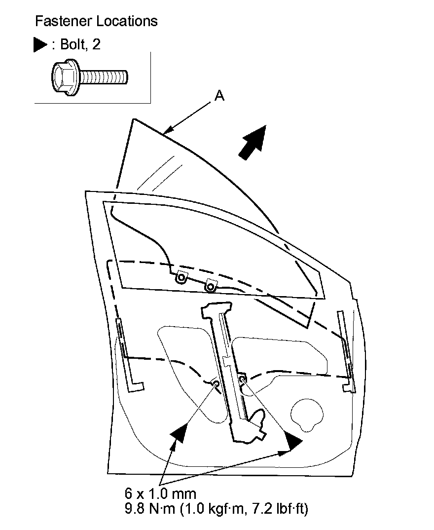 4. Carefully raise the glass (A) until you can see the bolts, then remove them. Carefully pull the glass out through the window slot. Take care not to drop the glass inside the door.