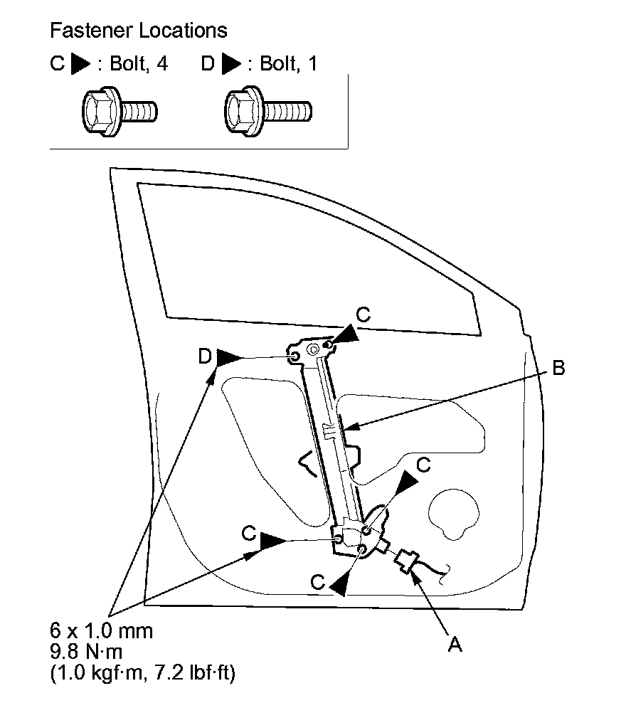 6. Remove the bolts (C), and loosen the bolt (D), then remove the regulator through the hole in the door.